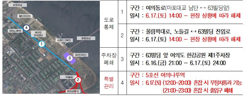 The first section of road control is Yeouido-dong-ro (from the southern end of Mapo Bridge to 63 Building), and the date and time will be lifted according to the site situation from 14:00 on Saturday, the 17th Control section 2: Olympic-daero, Nodeul-gil, 63 Building access road, date and time, and release according to the situation on the site from 14:00